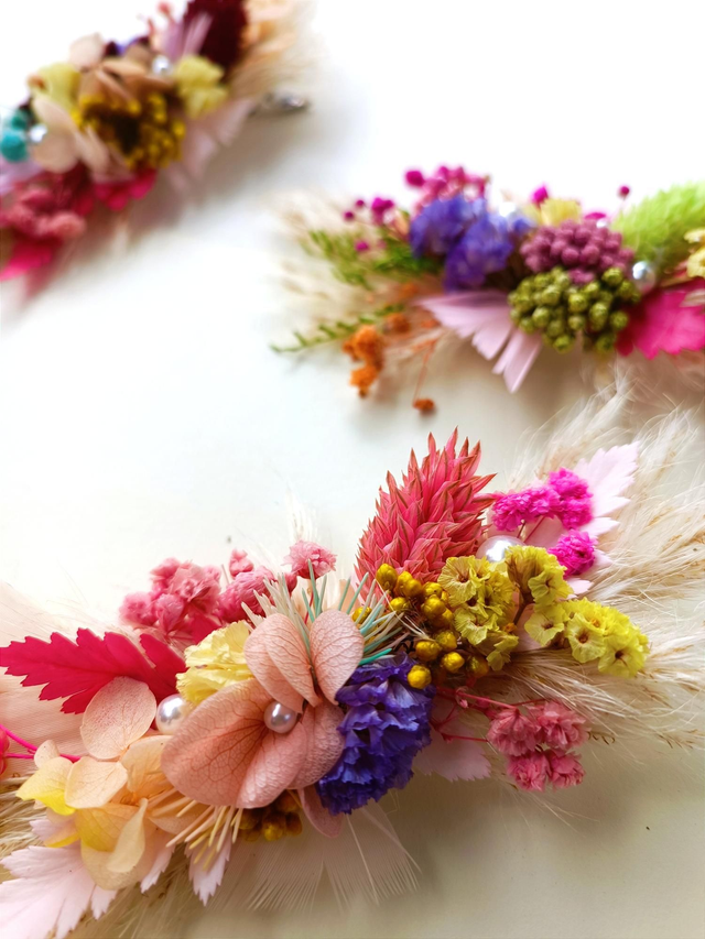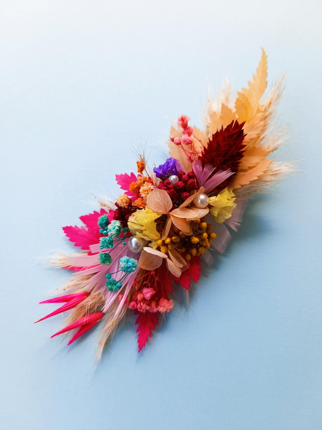 Barrette composée de fleurs séchées et stabilisées multicolores.