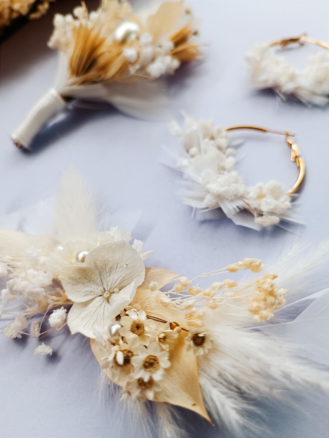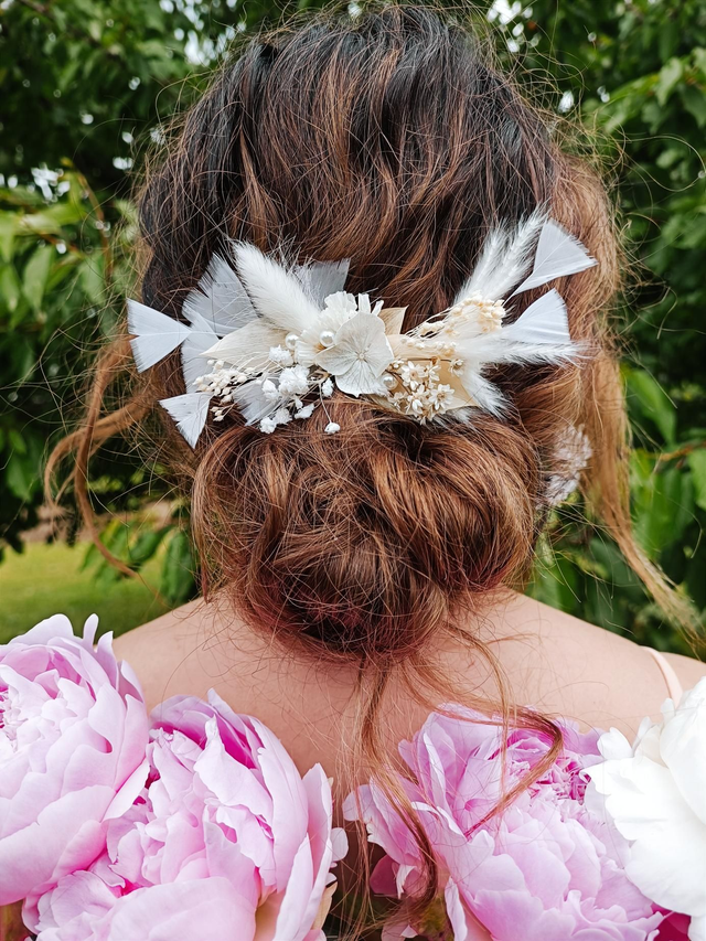 Jolie barrette composée de plumes, et de fleurs séchées et stabilisées de couleurs blanches.