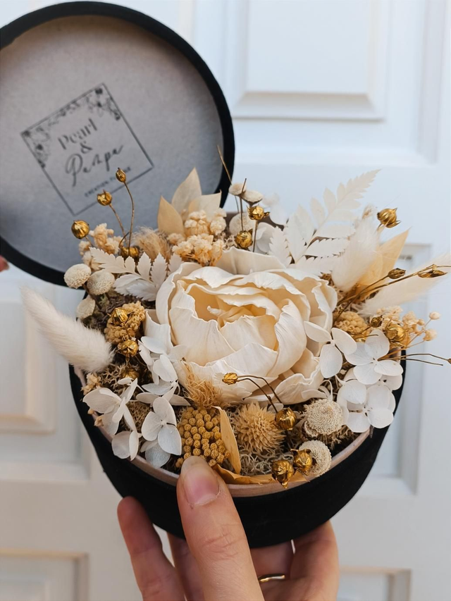 Boîte en velours noire garnie de fleurs séchées et stabilisées, dans les tons blancs et beiges, avec une touche de dorée.