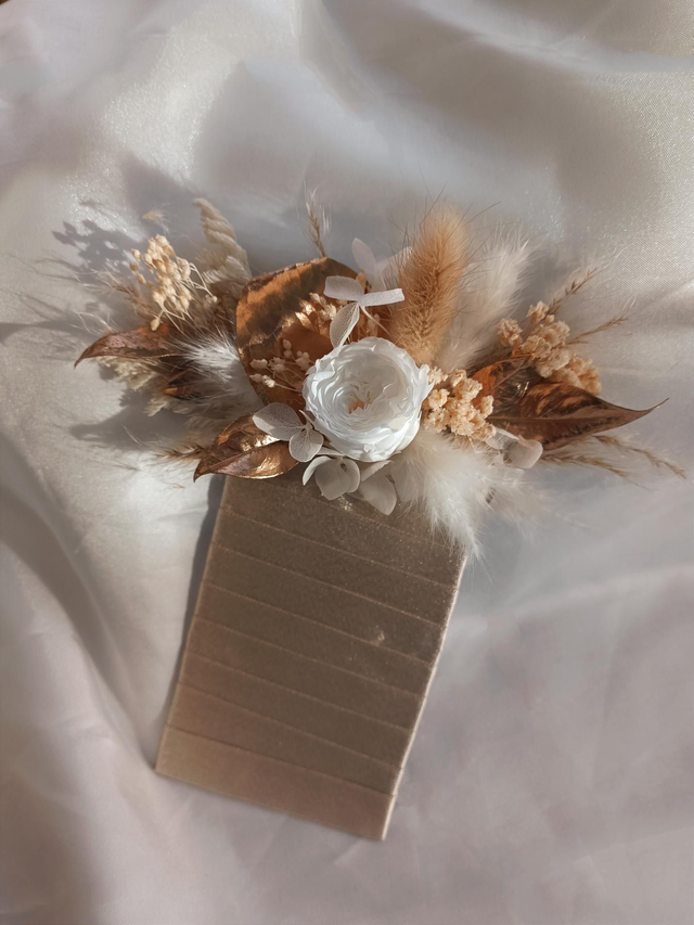 Boutonnière de poche en satin ornée de fleurs séchées et stabilisées blanches, beiges et dorées.