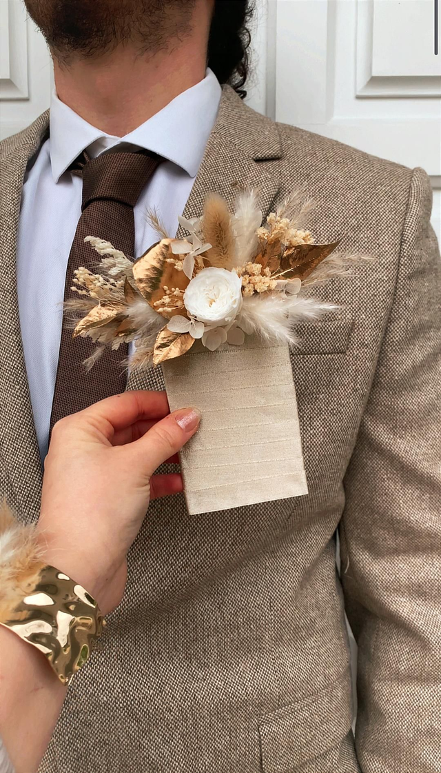 Apportez une touche originale aux costumes des mariés et des témoins avec cette boutonnière de poche, une version plus moderne de la boutonnière classique.