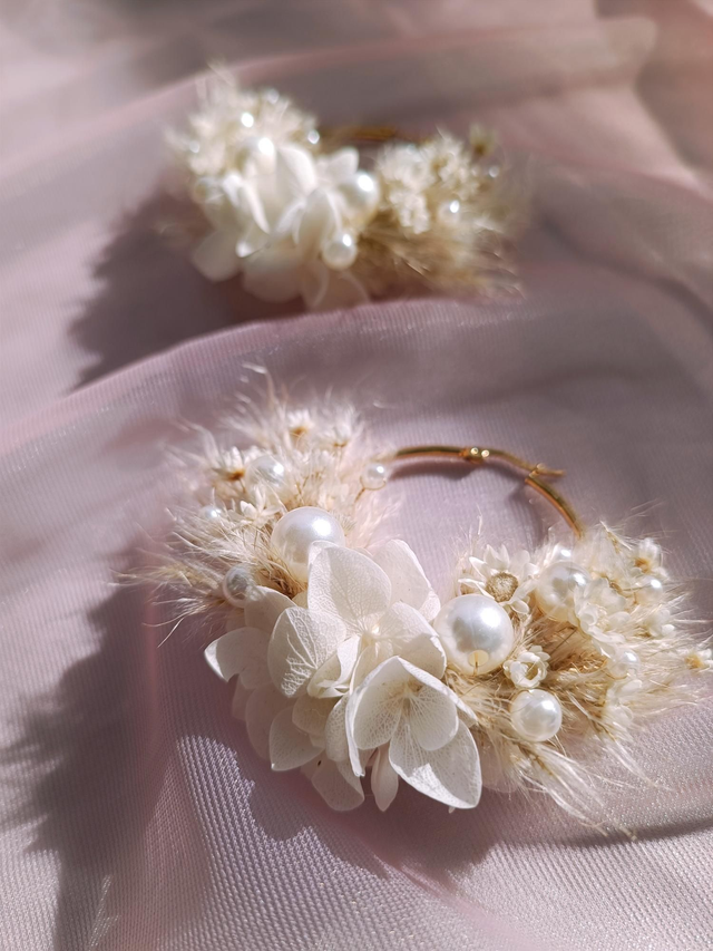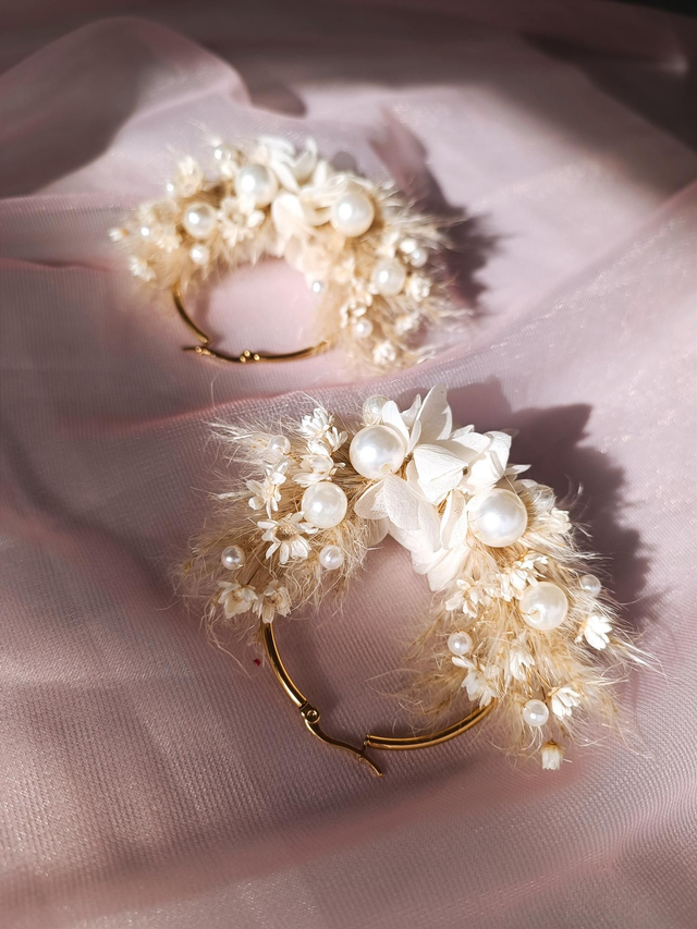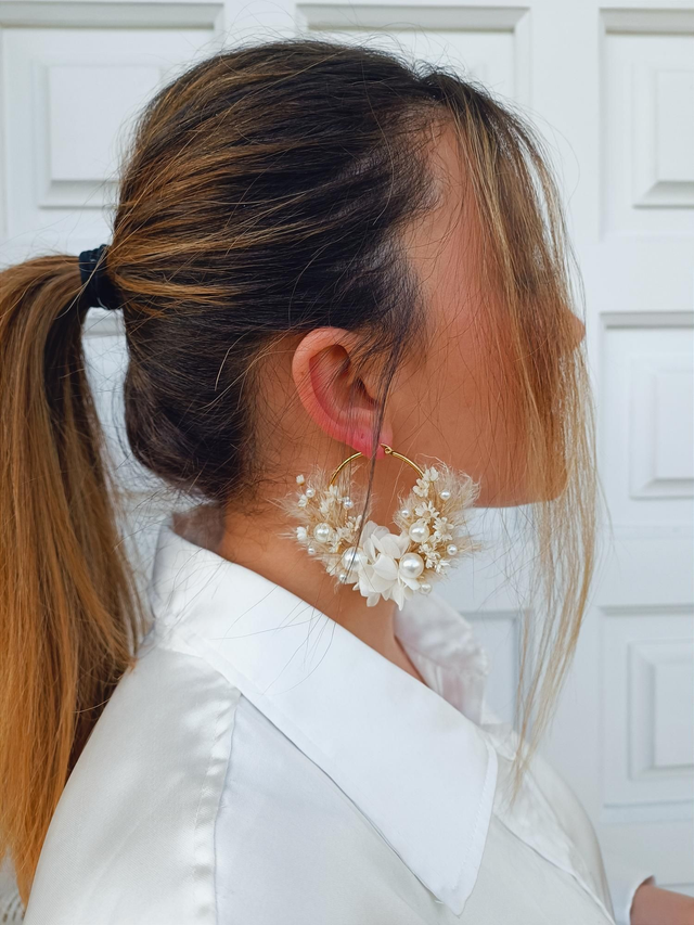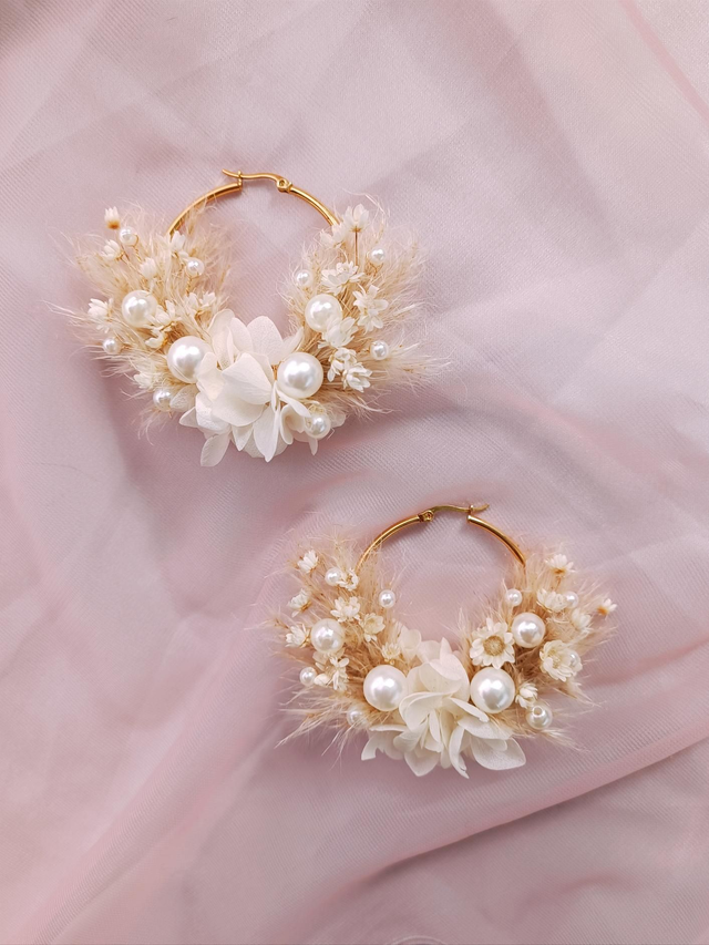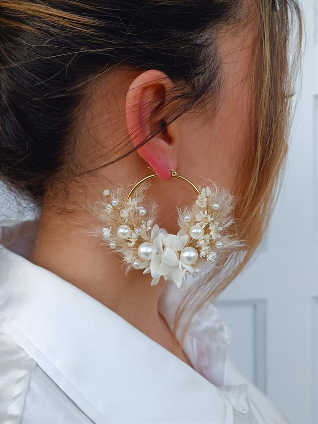 Ces boucles d'oreilles créoles sont en acier inoxydable doré, elles sont accompagnées de perles, de fleurs séchées et stabilisées de couleurs beiges et blanches.