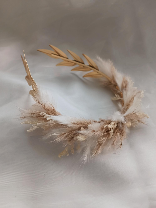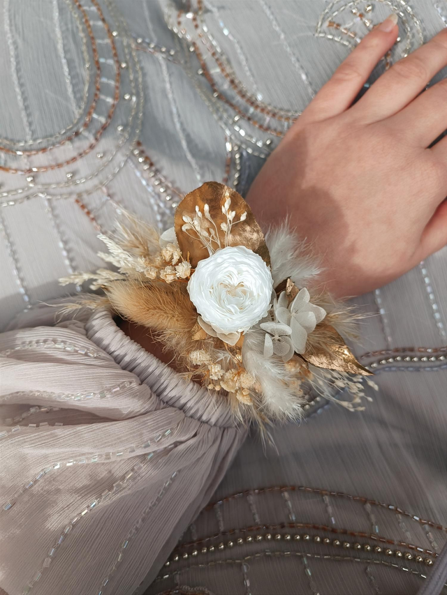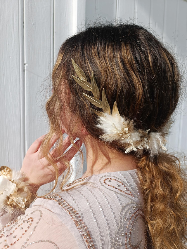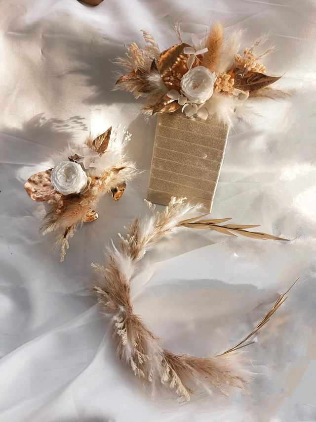 L'ensemble d'accessoires doré est en fleurs séchées et stabilisées blanches, beiges et dorées.