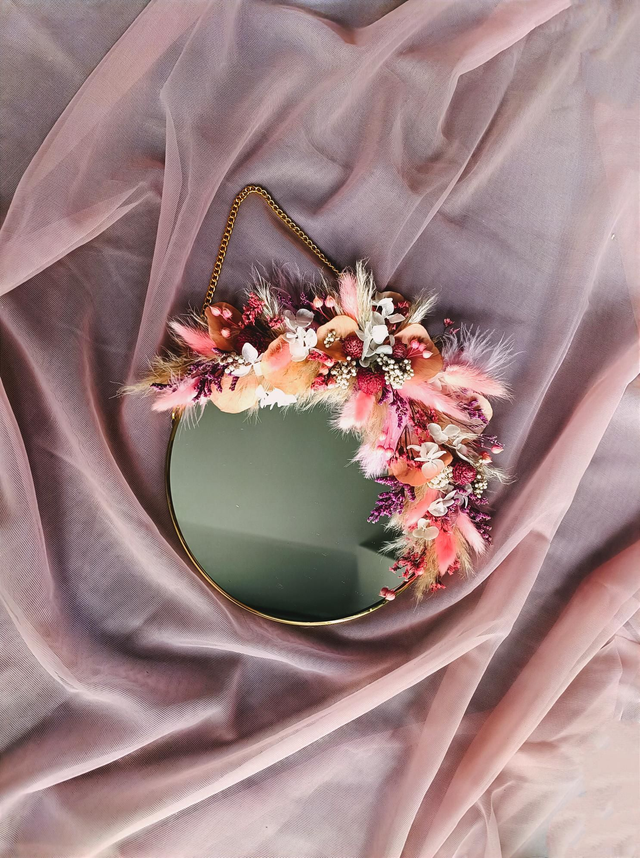 Miroir rond avec une bordure et une chaîne dorées, orné de fleurs séchées et stabilisées aux couleurs vives.