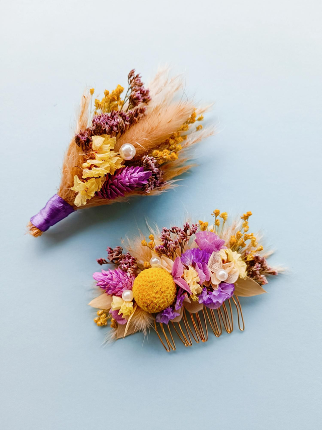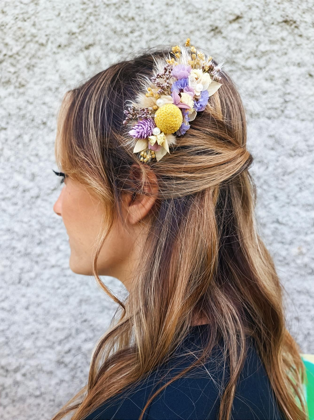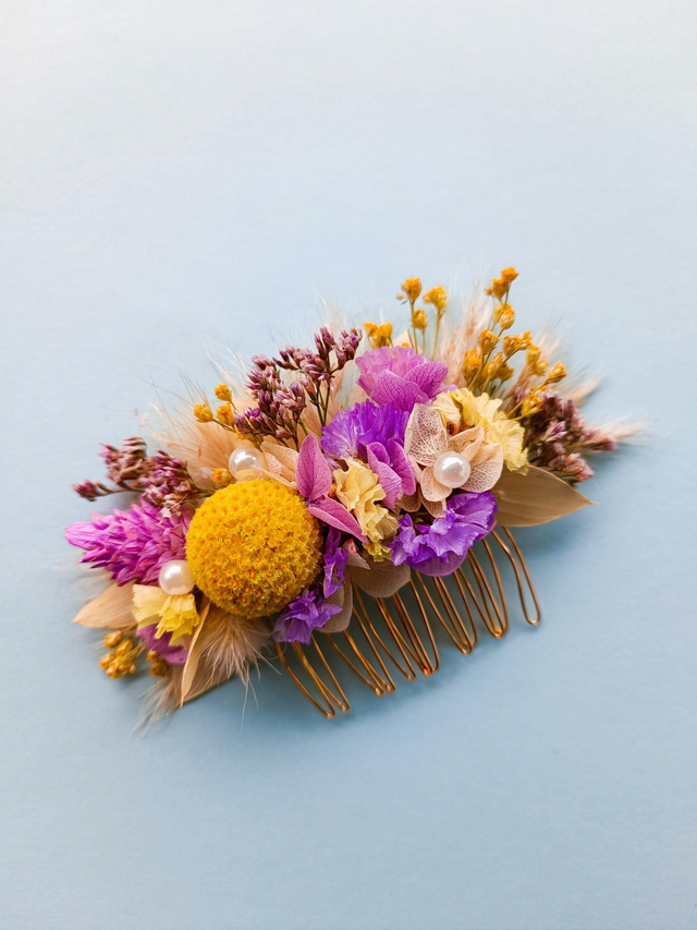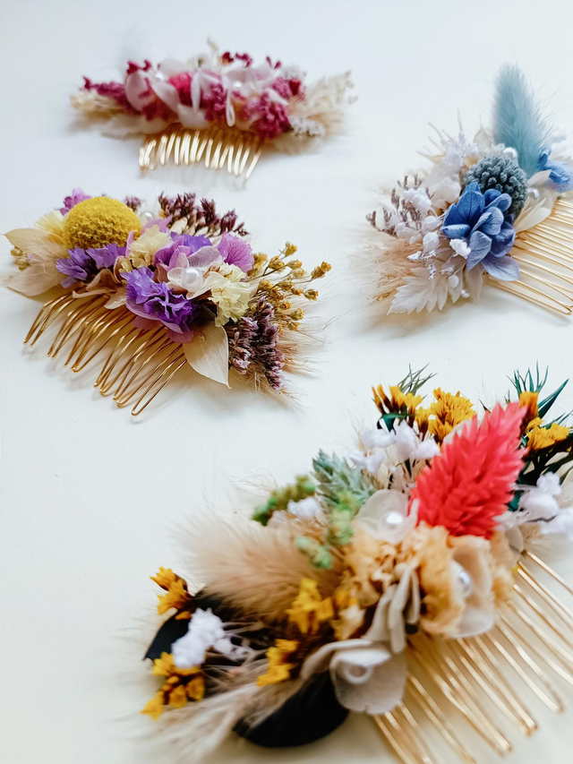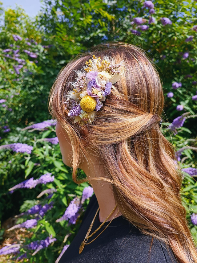 Que se soit votre mariage ou celui de l'un de vos proches, une occasion particulière ou simplement pour tout les jours, ce peigne fait de fleurs séchées et stabilisées viendra finir d'habiller votre tenue avec délicatesse.