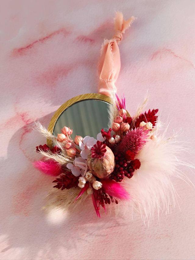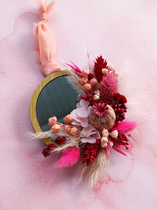 Petit miroir décoratif en bois, à suspendre grâce à son ruban ou simplement à poser, dans des teintes roses et rouges 🌸