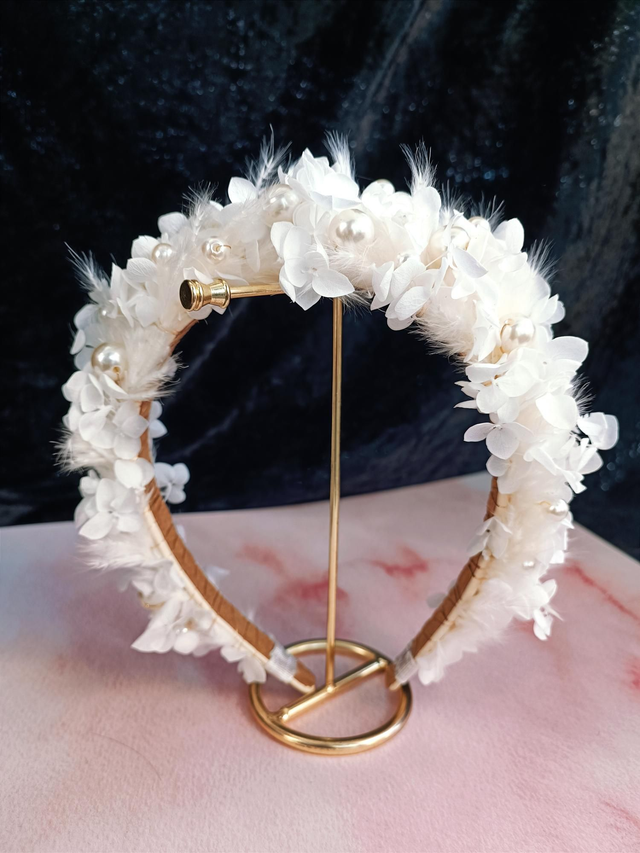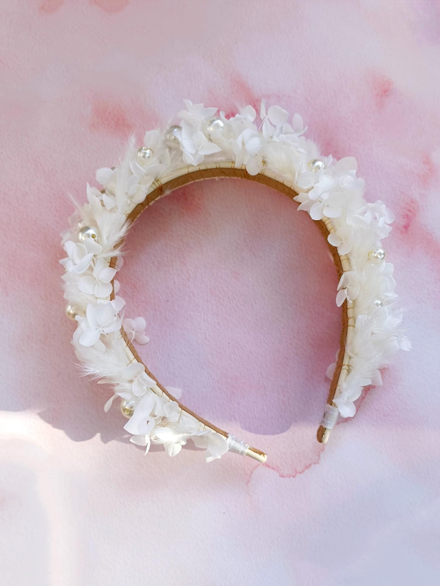 Serre-tête de mariage alliant la délicatesse des perles à l’authenticité des fleurs séchées, pour une touche naturelle et élégante le jour de votre mariage.