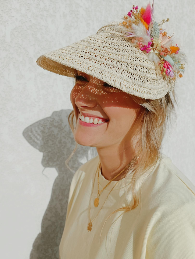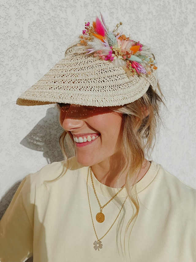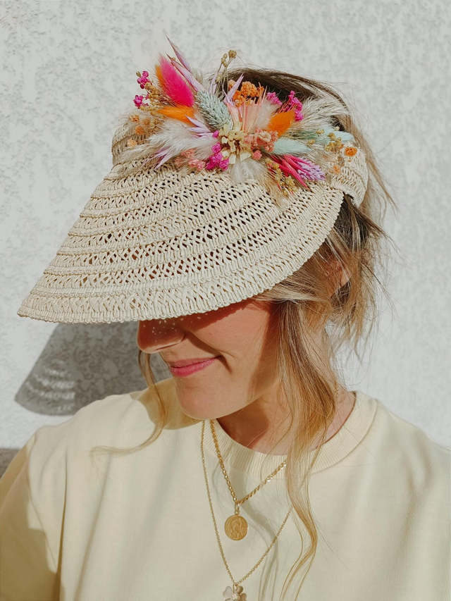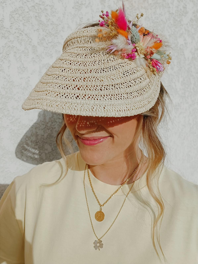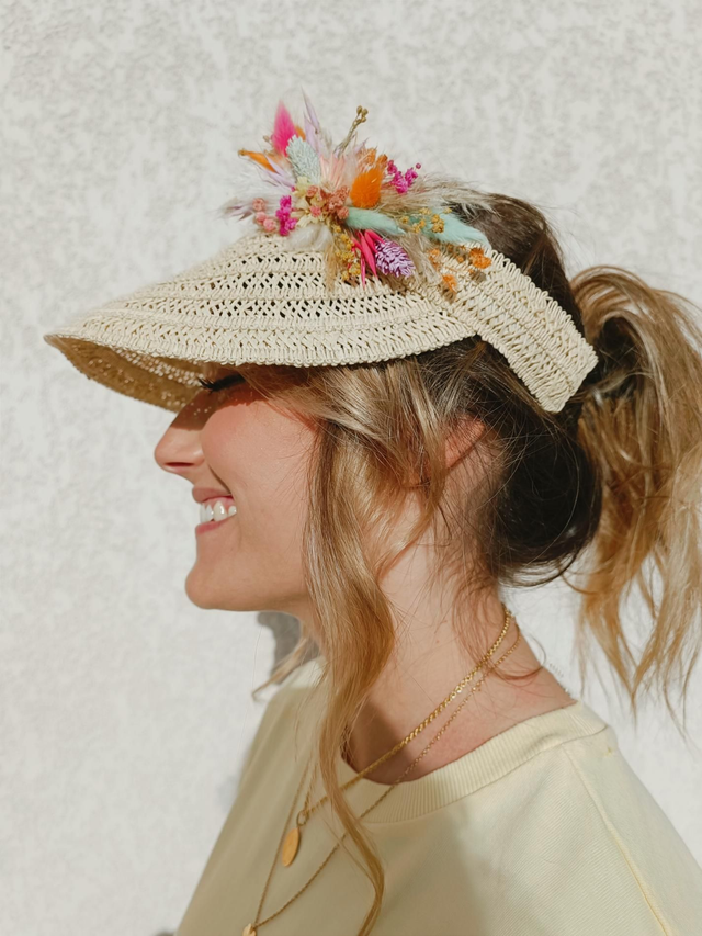 Visière en paille ornementée de fleurs séchées et stabilisées.